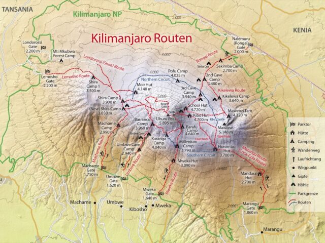 Zur Besteigung des Kibo mit seinem Gipfel, dem Uhuru Peak („Uhuru“ ist Kiswahili für „Unabhängigkeit“), stehen verschiedene Routen zur Verfügung:
