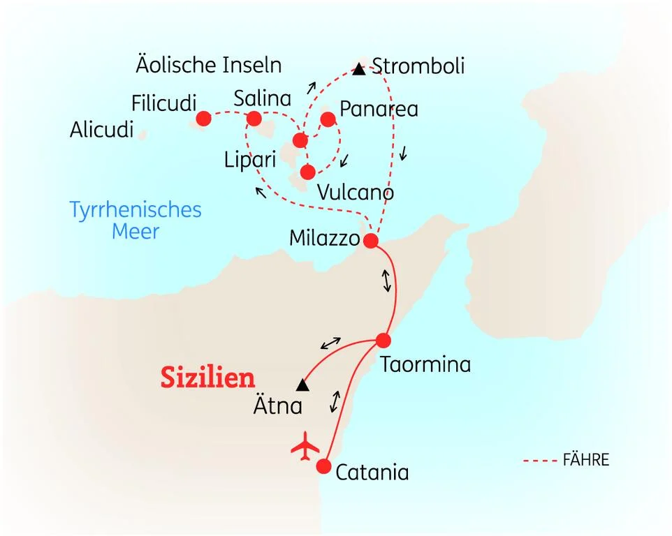 Heute heißt es „Auf Wiedersehen Sizilien, auf Wiedersehen Äolische Inseln!“. Mit öffentlichen Verkehrsmitteln gelangen Sie zum Flughafen Catania und fliegen zurück nach Hause.