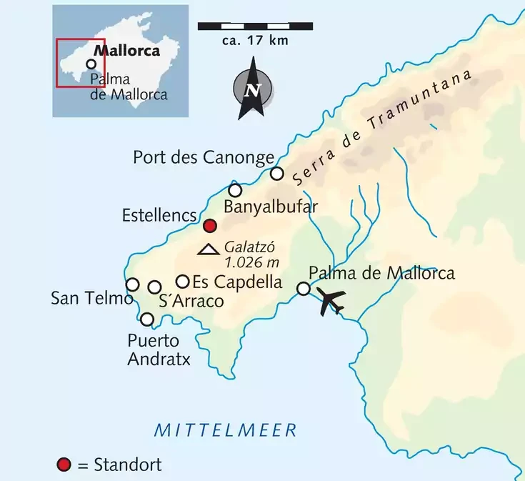 Lage: Im urigen Dorf Estellencs im Südwesten Mallorcas auf ca. 200 m Höhe am Fuß der Serra de Tramuntana. Die Lage bietet hervorragende Panoramablicke über die Südwestküste. Trubel und Hektik sind hier unbekannt.