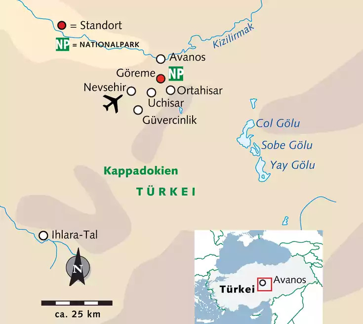 Scheinbar von Feenhand aufgestellte Felsgebilde leuchten im Sonnenlicht und in der Abenddämmerung. Canyons, Türmchen, Pyramiden, Kamine und Kegel bilden eine Landschaft wie ein Kunstwerk aus Tuffstein. In den Fels gehauene Sakralbauten und mehrstöckige unterirdische Wohnstätten, die einst ganze Dörfer und Städte bildeten, schaffen eine malerische Wunderwelt. Kappadokiens Täler und Ebenen bieten fast unendliche Möglichkeiten, auf den Wanderungen immer wieder etwas Neues zu entdecken.