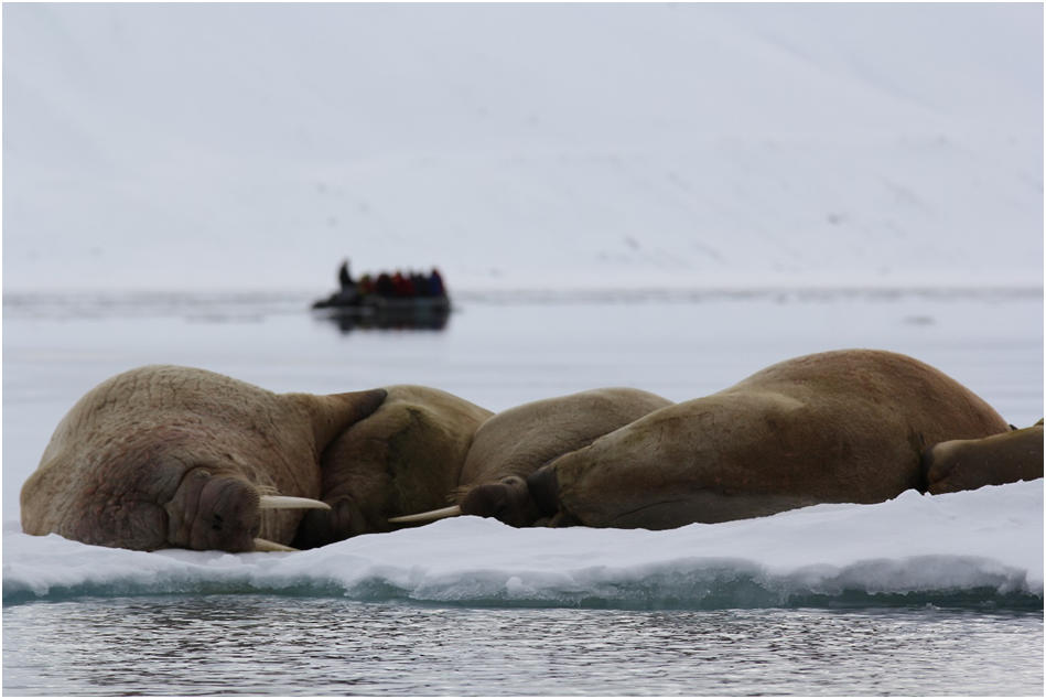 Nette Crew, gutes Essen, und der Nordatlantik zeigt gleich nach dem Verlassen des Isfjordes seine Zähne. Ich verschlafe das Geschaukel und wache am nächsten Tag am Eingang des Liefdefjordes in ruhigem Fahrwasser auf. Trotz tiefhängender Wolken ein wunderbarer Anblick, Gletscherfronten am Ufer des Fjords vor dick verschneiten Bergen. Stehe in dicker Montur mit Fernglas und Teleobjektiv stundenlang an Deck, fasziniert von dieser fremden, wunderbaren Landschaft. Am Fjordende noch Eis vor dem Monacobreen, einem der schönsten Gletscher Spitzbergens. Wir sehen viele Vögel, Robben und wahrhaftig die ersten Eisbären in der Ferne. Auf einer Eisscholle machen mehrere Walrossbullen in aller Seelenruhe ein Verdauungsschläfchen und lassen sich auch nicht dadurch stören, dass wir mit den Zodiacs vorsichtig bis auf 20 Meter an sie heranfahren.